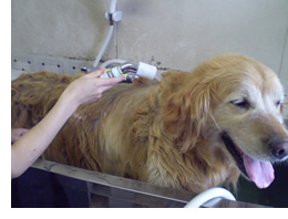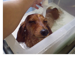 マイクロバブル・ウォッシュ・システムでは通常行われるシャンプー洗浄とは異なりワンちゃんの皮膚に直接手で擦り、刺激を与えるような事はありません。